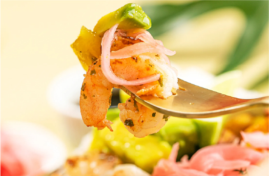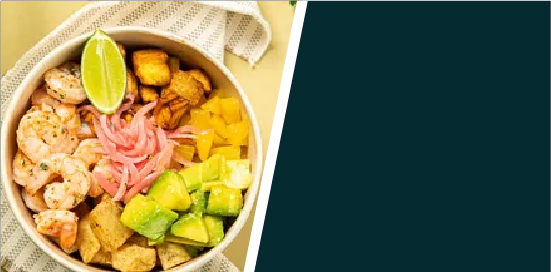 Bowl de camarones salteados al limón (120 gr), cebolla encurtida, piña caramelizada, plátano maduro, maíz tierno y base a la elección.